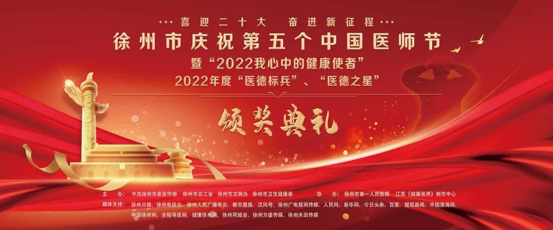 为庆祝第五中国医师节,充分展示全市医疗卫生人员良好的职业道德风范,发挥先进典型的示范引领作用,营造全社会尊医重卫的良好氛围,迎接党的二十大胜利召开,8月19日下午,由中共徐州市委宣传部、市总工会、市文明办、市卫健委联合主办的“徐州市庆祝第五个中国医师节暨2022我心中的健康使者、2022年度医德标兵、医德之星”颁奖活动在徐州市第一人民医院学术报告厅举办。