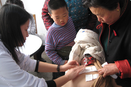 穴位敷贴疗法是指在人体背部穴位表面贴压药物持续刺激穴位,并借助药物的性能,使药性从皮肤表面进入人体,并循经络传导发挥宣肺通络,化痰止咳平喘的作用,又可改善局部的血液循环,起到活血化瘀、增强人体免疫功能的作用,以此达到治疗疾病的目的。该法擅调治多种慢性顽固性疾病,尤其对于支气管哮喘(各型过敏性哮喘、喘息性支气管炎等)及反复呼吸道感染有十分满意的疗效。