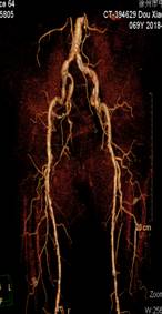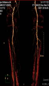 窦××,男,79岁,“右足部疼痛伴局部破溃半年”入院,间歇性跛行200米,右踝关节局部1.5×1.5cm2溃疡,第5趾底1.0×1.0 cm2溃疡,表面渗出物。糖尿病病史23年,高血压病史23年,脑梗塞病史7年。下肢动脉CTA示双下肢动脉广泛斑块形成,多发狭窄,双侧膝下动脉间断显示,大部闭塞。经药物治疗10天,疼痛消失,可自行持续行走1000米以上双下肢无不适,原足趾部溃疡愈合,踝关节部溃疡结痂。