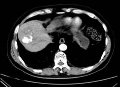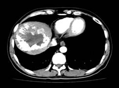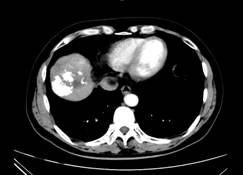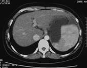 张××,男,56岁,外院CT增强示肝右叶“巨块型肝癌”,首次介入治疗后复查CT(2012年4月25日)所见瘤体大部栓塞,周围组织损伤小(图1a~b)。3年9个月后复查(2016年1月21日)见原瘤体明显缩小,上方肝实质复发病灶(图2a~b)。