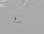 朱××,男,45岁,双侧股骨头坏死,左侧髋关节疼痛明显,不能独立行走,需使用止痛药物(图1,MR)。介入治疗术中造影(图2a)示:股骨头供血动脉分支稀疏,远端痉挛、股骨头骨质内无明显分支动脉血管;治疗后(图2b)造影见股骨头供血动脉分支血管明显增多,远端可见达股骨头骨质内,原髋关节疼痛消失,自行行走出院。